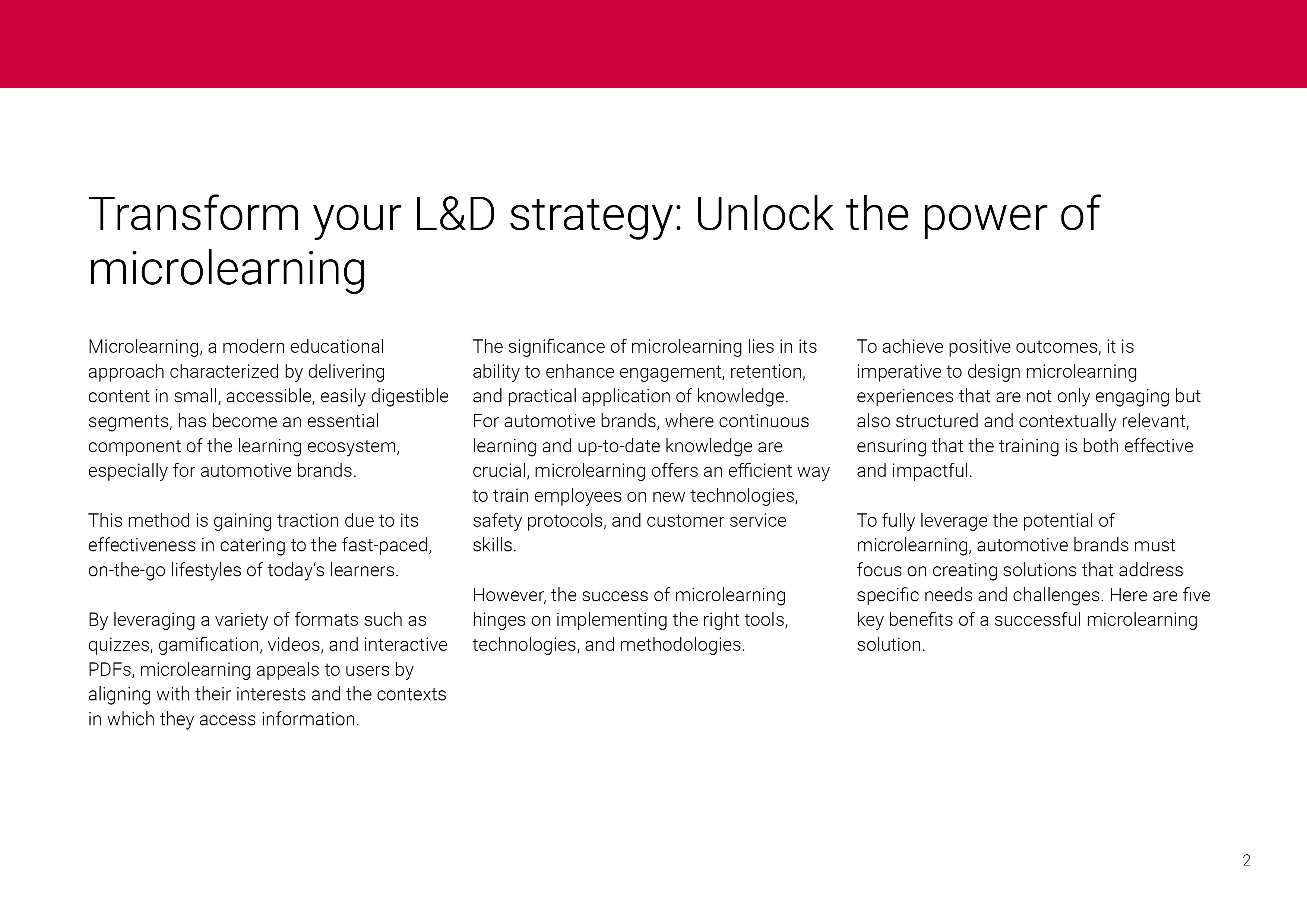 For automotive brands, where continuous learning and up-to-date knowledge are crucial, microlearning offers an efficient way to train employees on new technologies, safety protocols, and customer service skills. However, success in microlearning depends on implementing the right tools, technologies, and methodologies.